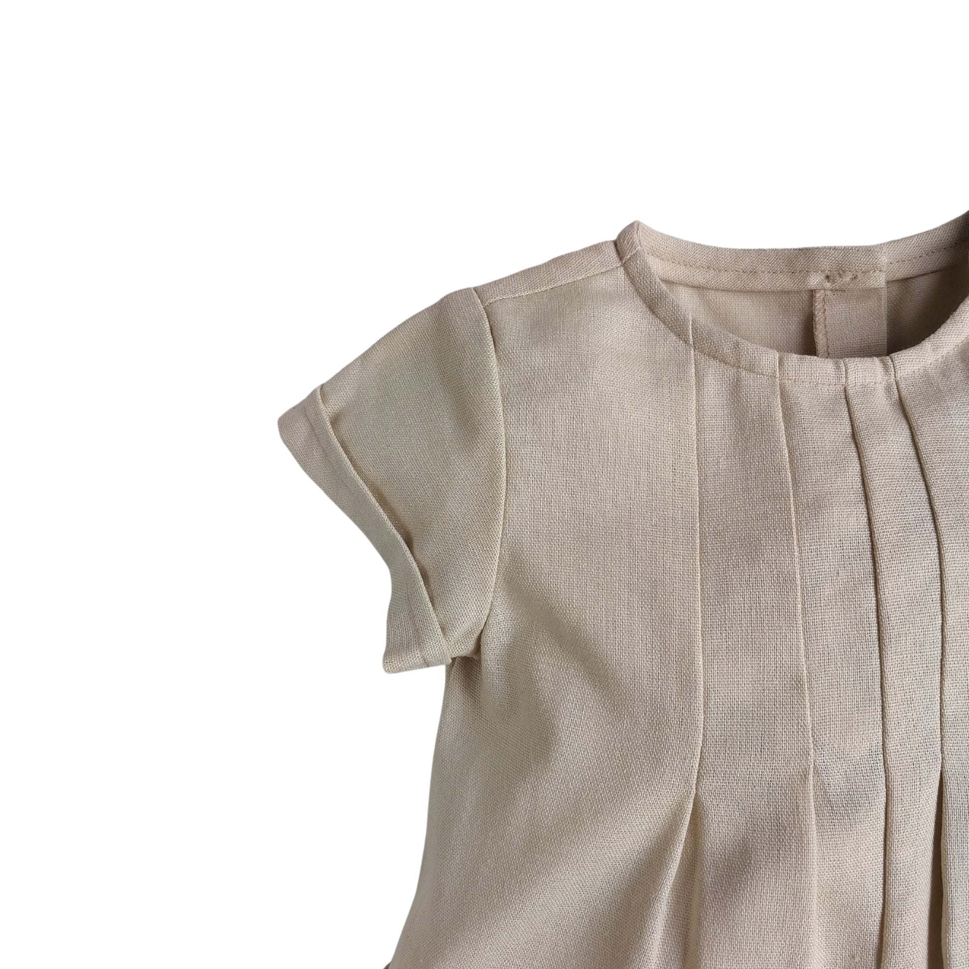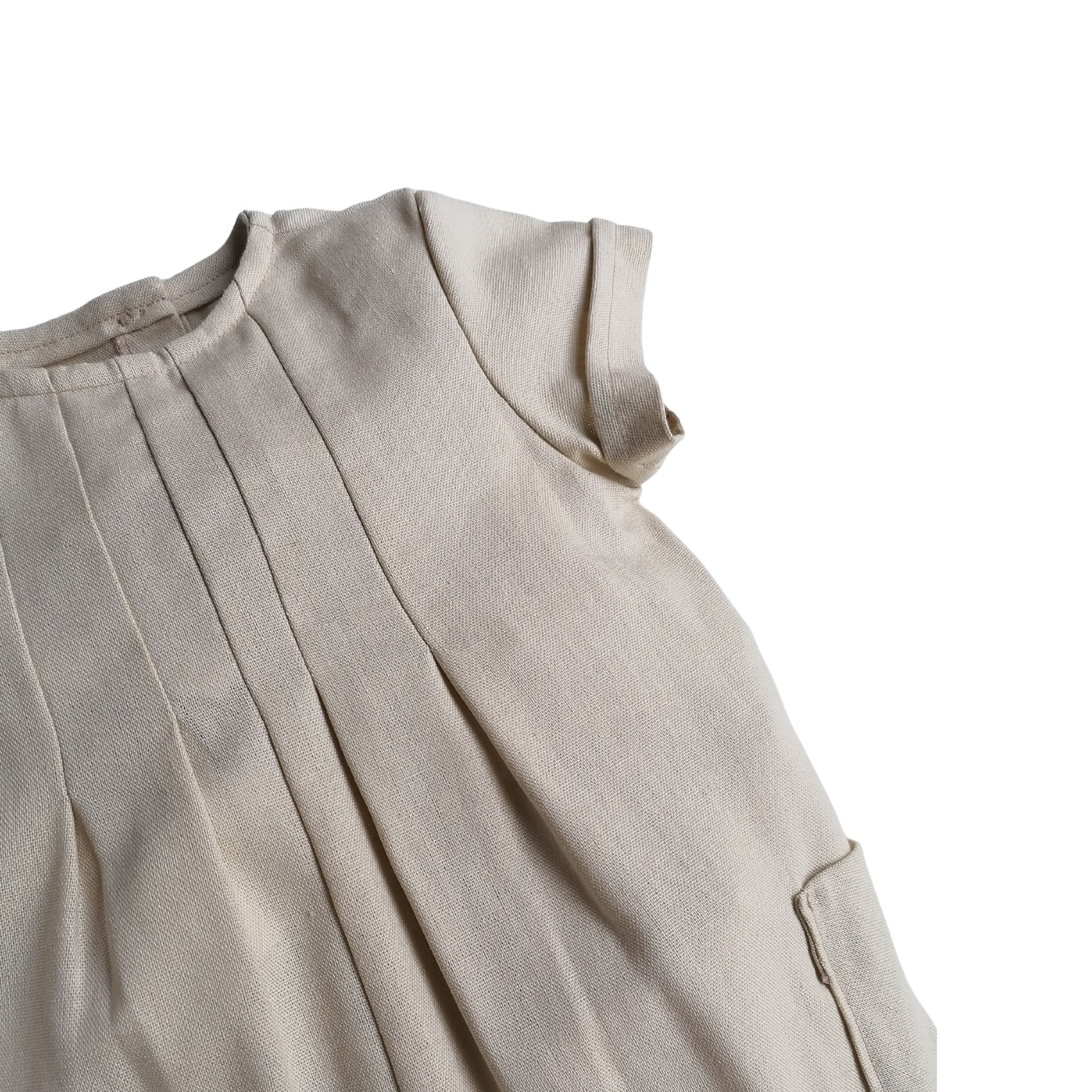 Short sleeve, round neck with pin-tucks down the front. The playsuit has two side pockets perfect for collecting rocks. It has press studs between the legs with button opening at the back.