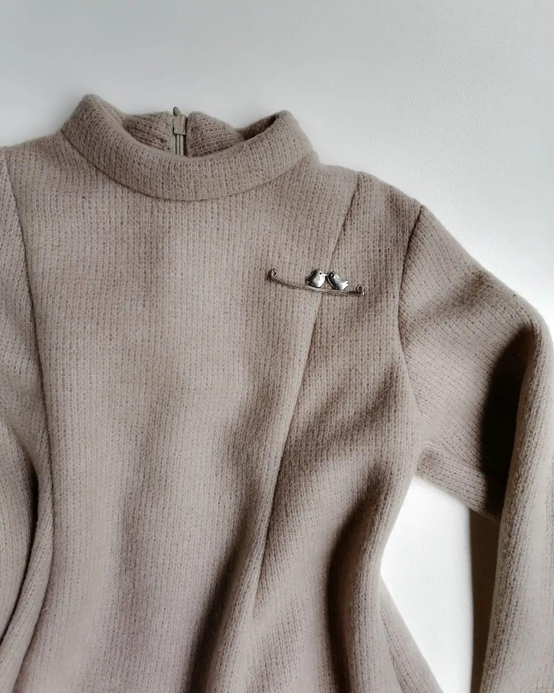 This dress has a high neck with a zip opening in the back and a little sew on bird brooch.